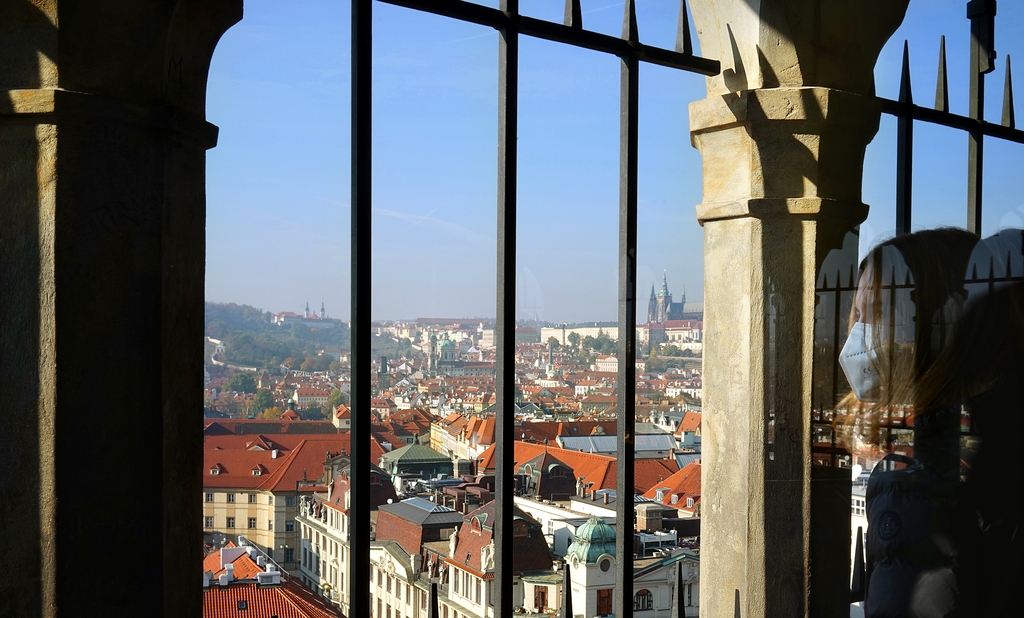 ▲ 옛 시청 전망대에서 프라하성과 시내를 구경하는 마스크를 쓴 여행자 / [사진/진성철 기자]