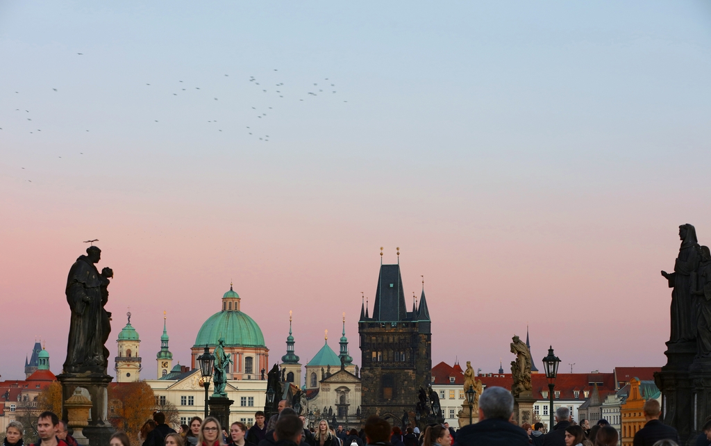 ▲ 노을이 분홍으로 엷게 물든 프라하 하늘과 카를교 [사진/진성철 기자]