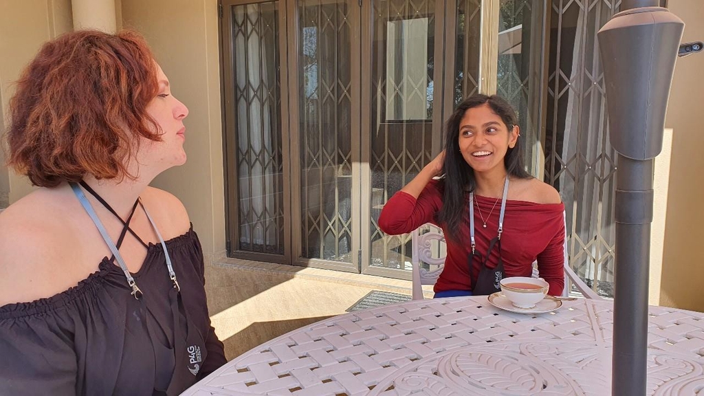| ▲ '급조했지만 4등 수상해 즐거워요' (프리토리아=연합뉴스) 김성진 특파원 = 17일 'C&V' 댄스팀의 로라(왼쪽)와 조안이 대사관저 바깥 파라솔 아래에 앉아 즐겁게 얘기하고 있다. 2021.9.18 sungjin@yna.co.kr |