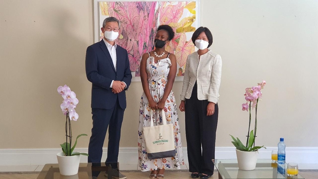 | ▲ BTS 뱁새 등으로 커버댄스 2등상을 받은 수전 응카타 (프리토리아=연합뉴스) 김성진 특파원 = 댄스 강사인 응카타가 17일 2등상을 받고 박대사 부부와 포즈를 취하고 있다. 2021.9.18sungjin@yna.co.kr |