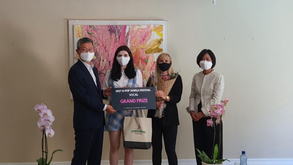 | ▲ 엄마와 함께 '가문의 영광' 남아공 K-팝 보컬 1등 수상 (프리토리아=연합뉴스) 김성진 특파원 = 17일(현지시간) 남아프리카공화국 수도 프리토리아에 있는 한국 대사관저에서 열린 K-팝 온라인 경연대회 시상식에서 보컬 부문 1등을 차지한 샤논 버튼(왼쪽서 두번째)이 박철주(왼쪽) 대사로부터 상을 받고 있다. 버튼 오른쪽은 어머니, 가장 오른쪽은 송정임 대사 부인. 2021.9.18 sungjin@yna.co.kr |
