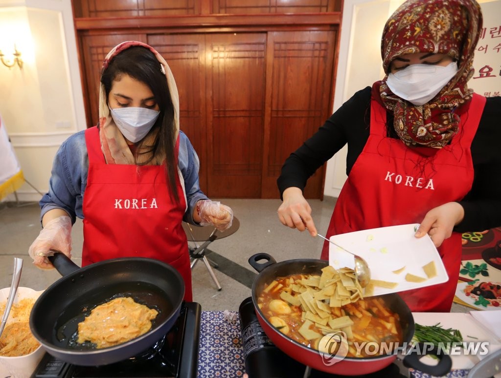 ▲ 한국 음식 만드는 이란인 (테헤란=연합뉴스) 이승민 특파원 = 17일(현지시간) 주이란 한국대사관에서 열린 '한국 문화 체험 행사'에서 이란인이 떡볶이와 김치전을 만들고 있다. 2021.12.17 logos@yna.co.kr