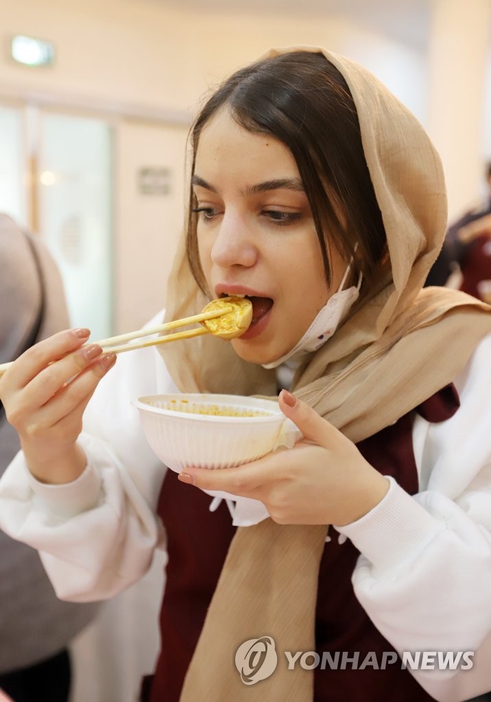 ▲ '맵다 매워' (테헤란=연합뉴스) 이승민 특파원 = 17일(현지시간) 주이란 한국대사관에서 열린 '한국 문화 체험 행사'에서 이란인 대학생이 떡볶이를 맛보고 있다. 2021.12.17 logos@yna.co.kr