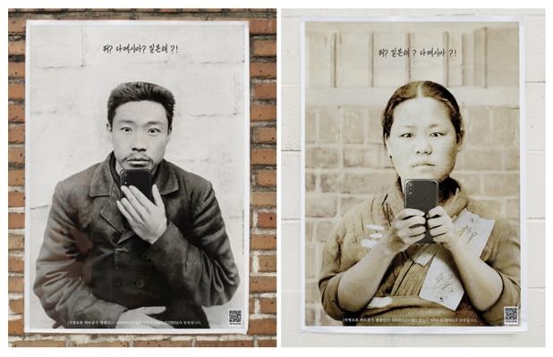 독립운동가 안중근 의사와 유관순 열사가 놀란 눈으로 스마트폰을 보는 광고물의 제목이다.