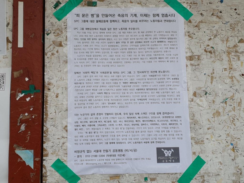 서울대 학생 모임 '비정규직 없는 서울대 만들기 공동행동'(비서공)은 20일 "'피 묻은 빵'을 만들어온 죽음의 기계, 이제는 함께 멈춥시다"라는 제목의 대자보를 대학 캠퍼스 내 여러 게시판에 게시했다.