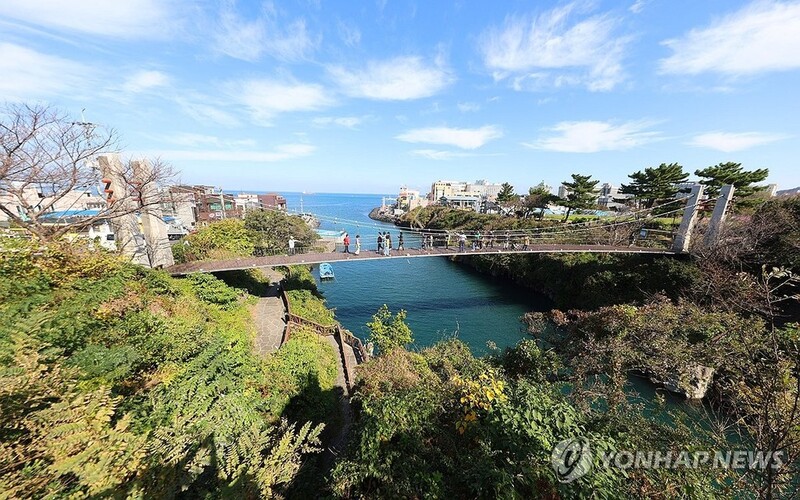 | ▲ 제주 구름다리 건너 가을로 (제주=연합뉴스) 맑은 가을 날씨를 보인 지난 10월 29일 오전 제주시 용연계곡에서 관광객들이 구름다리를 건너며 아름다운 제주 경관을 즐기고 있다. [연합뉴스 자료사진] |