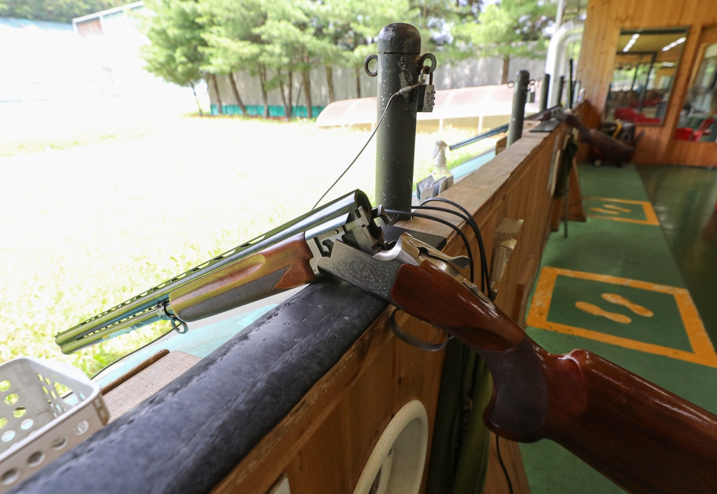 | ▲ 클레이 사격 체험장에 총신이 꺽인 채 놓여 있는 산탄총 [사진/진성철 기자] |