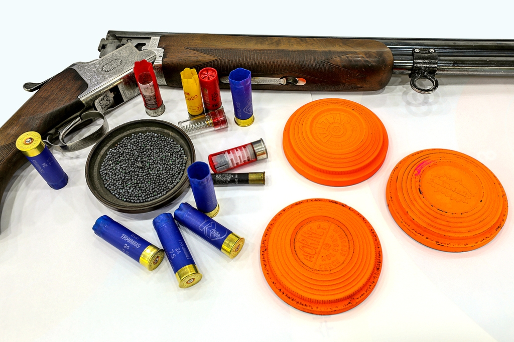 | ▲ 중절식 브레이크 액션 방식의 산탄총과 엽탄, 클레이 접시 [사진/진성철 기자] |