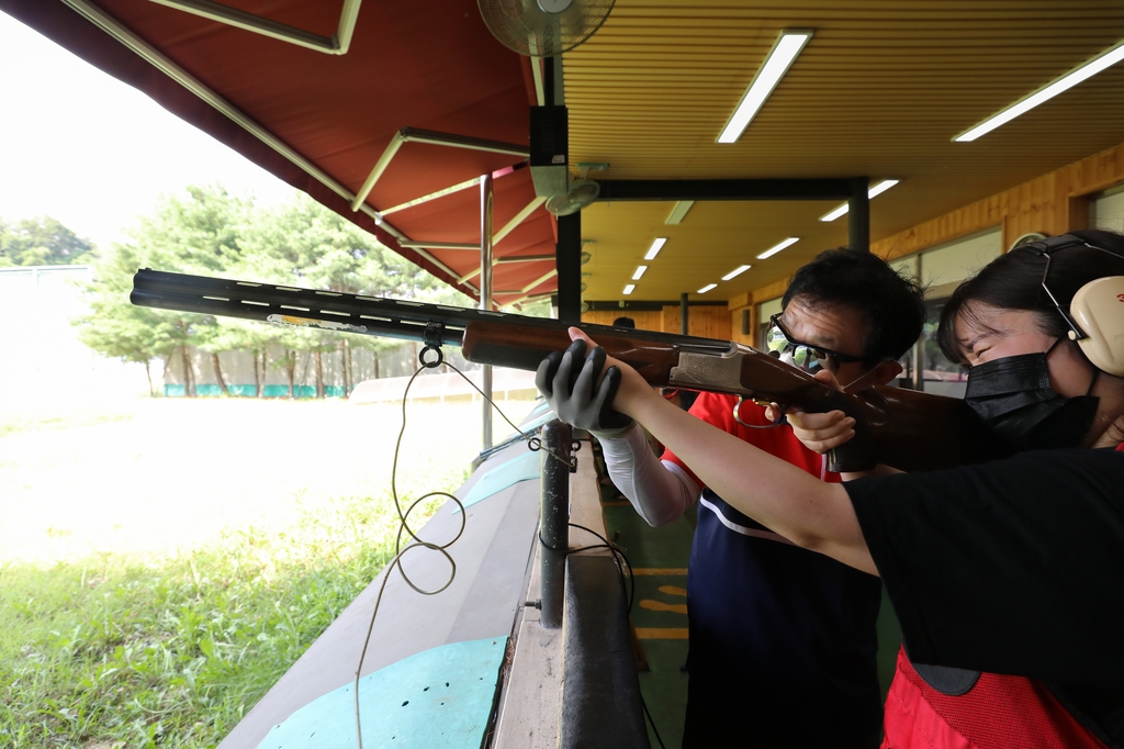 | ▲ 경기도사격테마파크 클레이 사격 체험장에서 방문객이 산탄총으로 날아가는 클레이 접시를 조준하고 있다. [사진/진성철 기자] |