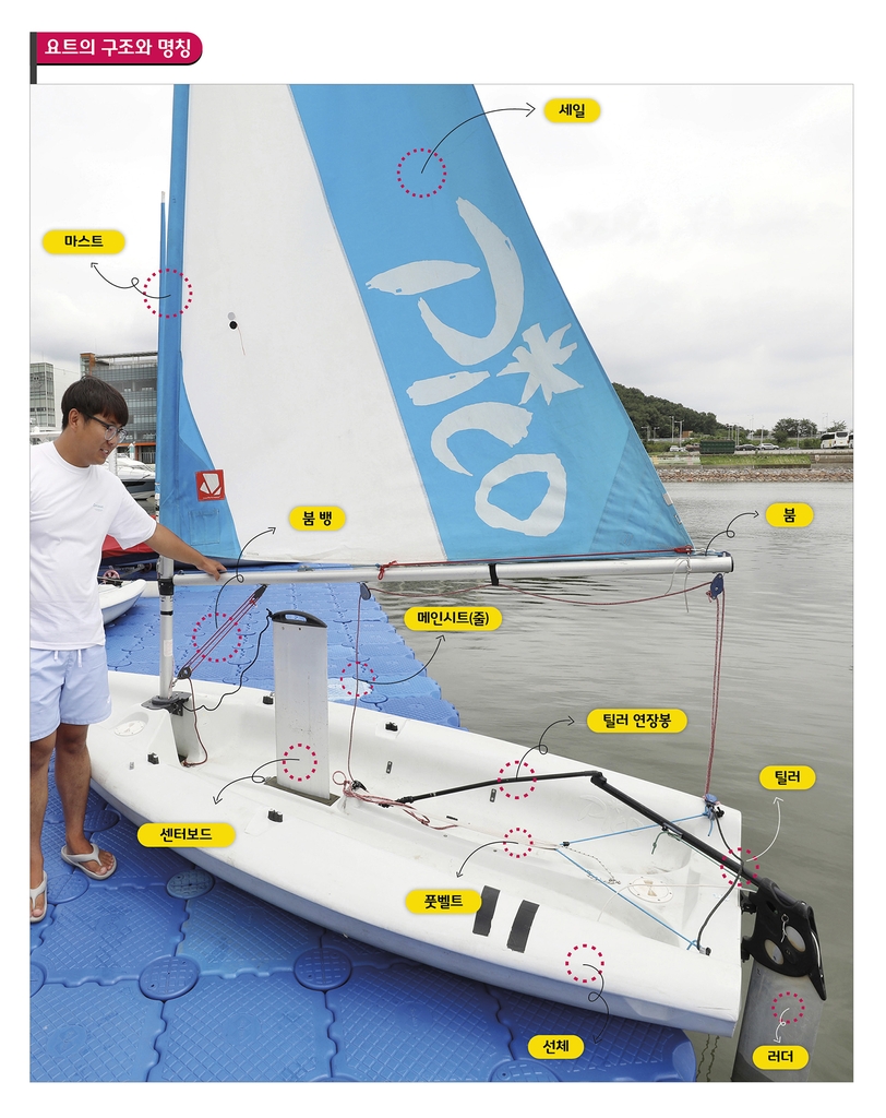 딩기 요트 중 초급자용인 레이저 피코(Pico)의 뱃머리를 바람이 불어오는 방향으로 놓았다. 포트(좌현)에 옆으로 앉았다. 맞바람을 받은 세일(돛)이 스타보드(우현)로 넘어가 펴졌다. 앞 손으로 세일을 조절하는 줄인 메인 시트를 쥐고, 뒷손으로는 틸러 연장봉을 잡았다. 틸러는 물에 잠긴 러더(키)를 조종한다. 러더를 움직이자 요트가 계류장에서 벗어났다.
