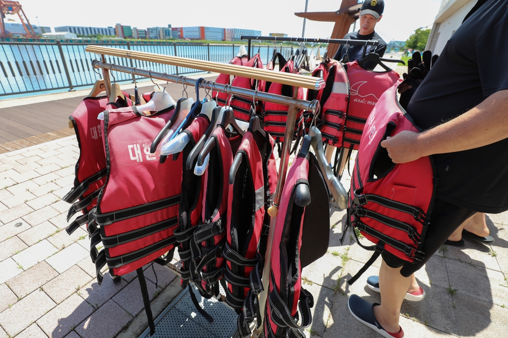 | ▲ 교육생들이 구명조끼를 입고 있다. [사진/진성철 기자] |