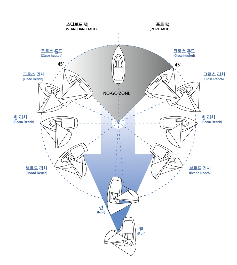 요트의 세일링 코스는 바람의 방향에 따라 나눈다. 바람이 불어오는 쪽을 기준으로 좌우 45도 각도는 요트가 범주할 수 없는 '노 고 존'(No Go Zone)이라 부른다. 이 구역에 빠진 요트의 세일은 펄럭이며 양력을 만들지 못한다. 노 고 존 아래 45~ 35도 각도는 크로스 홀드(Close hauled)로 풍상 코스에서 가장 효율적인 항해 길이다. 크로스 홀드 아래는 크로스 리치(Close Reach), 바람 방향과 90˚를 이루는 좌우는 빔 리치(Beam Reach)다. 초급자들이 처음 배우는 세일링 코스는 빔 리치다.