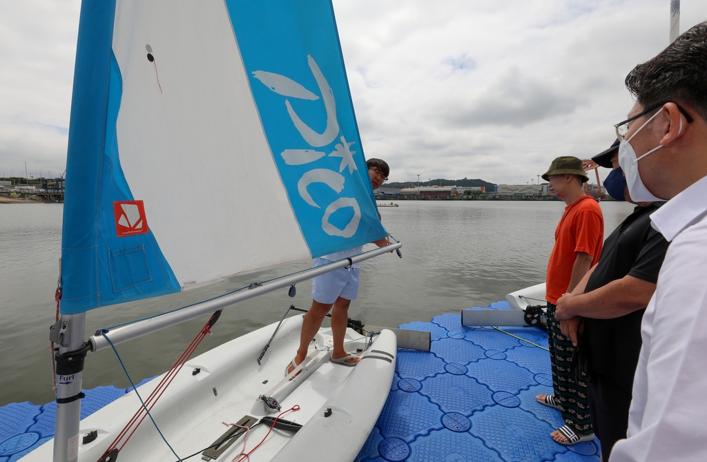 | ▲ 경기요트학교에서 딩기 요트 초급반 교육생이 코치의 지도를 받고 있다. [사진/진성철 기자] |