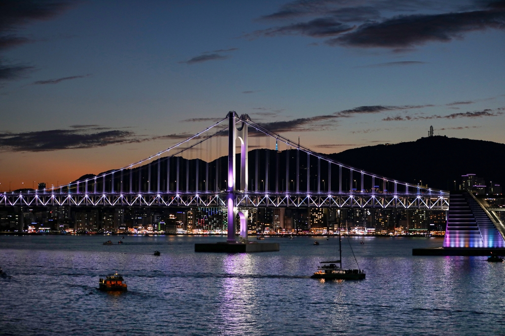 사람들은 바다 위에서 보랏빛 하늘과 마린시티, 광안대교와 동백섬의 누리마루, 해운대의 야경을 배경으로 추억을 담았다.