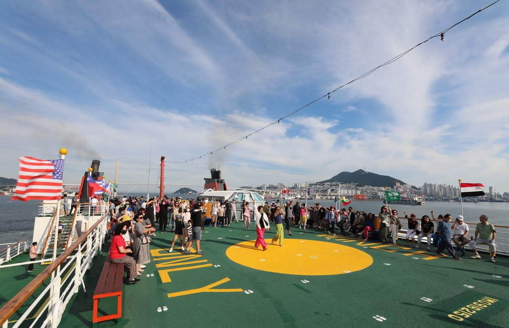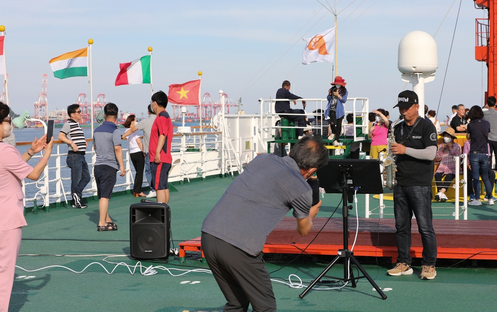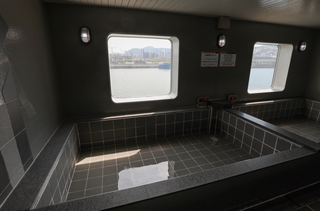 출항 이벤트가 끝난 뒤 승객들은 선상 야외 카페에서 맥주를 마시며 부산 연안 풍경을 바라봤다. 선상 사우나에서 바다를 보며 소금기를 씻어 내기도 했다.