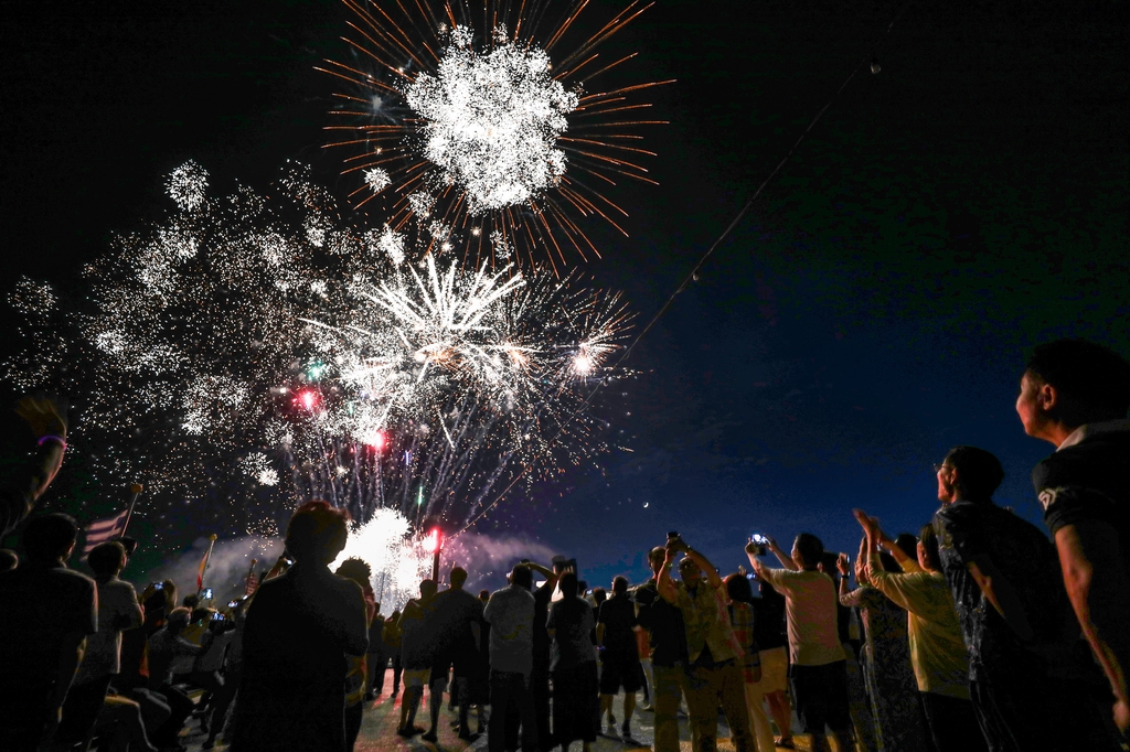 주말 밤바다 위에서 불꽃 쇼가 펼쳐졌다. 밤하늘 위로 솟구쳐 터지는 불꽃에 사람들은 감탄했다.