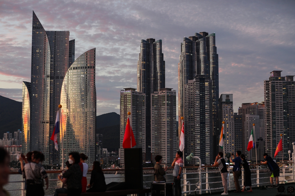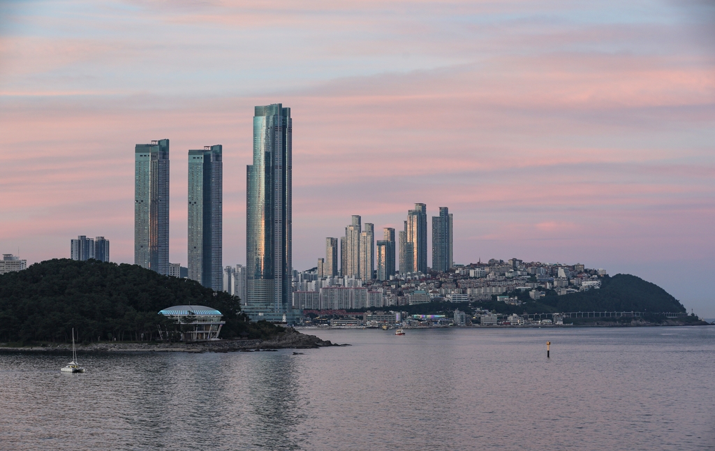 | ▲ 석양에 노랗게 물든 마린시티의 초고층 빌딩들 [사진/진성철 기자] |