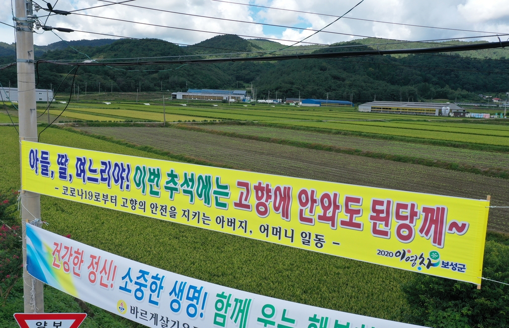 | ▲ 전남 보성군 거리에 코로나 팬데믹으로 고향 방문을 자제해 달라는 내용의 현수막이 걸려있다. 2020년 [연합뉴스 자료사진] |