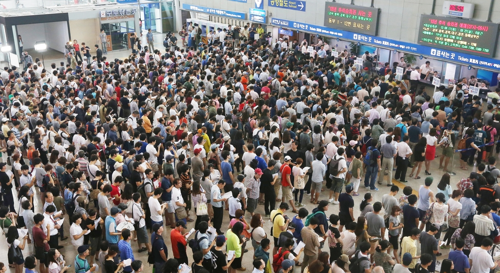 | ▲ 추석 열차 승차권을 예매하기 위해 서울역 창구에 몰려든 시민들. 2013년 [연합뉴스 자료사진] |