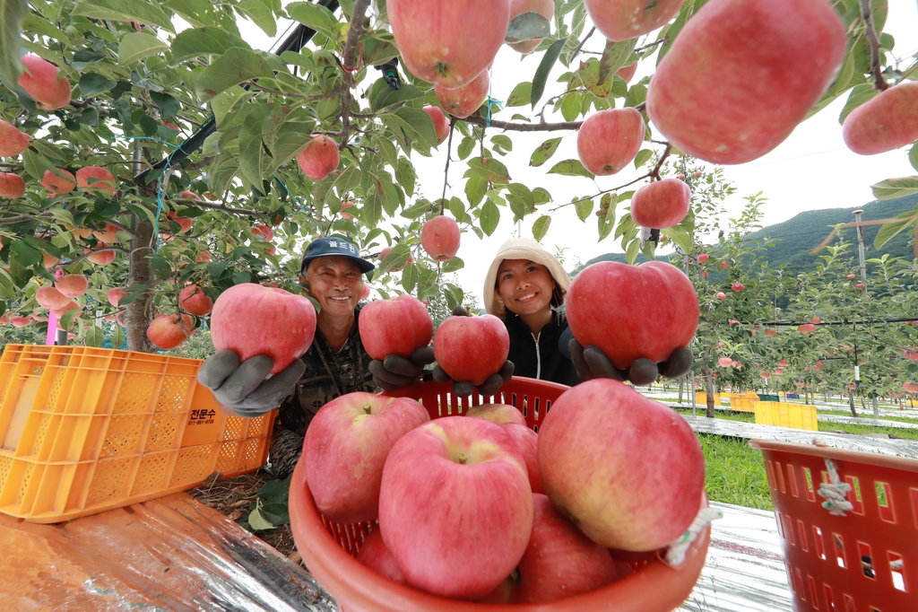 | ▲ 추석용 홍로사과를 수확하는 농민들. 2020년 [함양군 제공] |