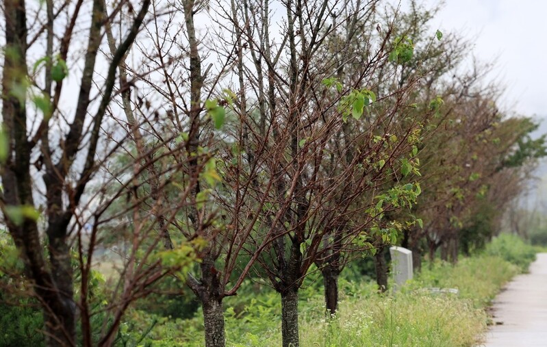 이곳 100여 그루의 벚나무 가운데 10여 그루만 녹색 나뭇잎이 정상적으로 남아 있을 뿐 나머지는 겨울처럼 잎이 모두 떨어져 앙상해 보기조차 흉한 모습이다.