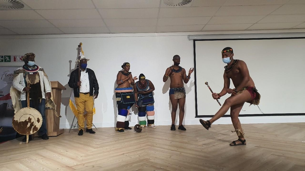 | ▲ 전통춤 추는 은데벨레족 (프리토리아=연합뉴스) 김성진 특파원 = 20일(현지시각) 주남아공 한국문화원에서 은데벨레족이 전통춤을 추고 있다. 이 종족의 왕자는 과거 조상들이 백인들과 8개월간 싸웠으며 한 왕은 프리토리아에서 교수형을 당하기도 했다고 증언했다. 2022.5.20 sungjin@yna.co.kr |