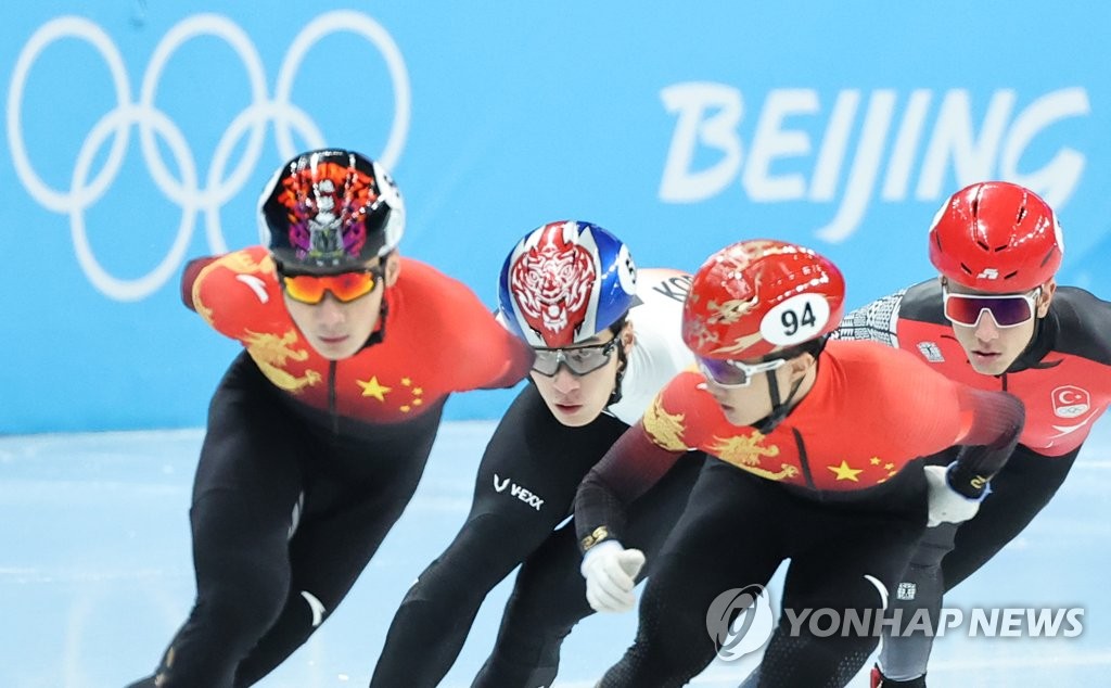 | ▲ Hwang Dae-heon of South Korea (2nd from L) skates between Ren Ziwei (L) and Li Wenlong (2nd from R) of China during the semifinals of the men's 1,000m short track speed skating race at the Beijing Winter Olympics at Capital Indoor Stadium in Beijing on Feb. 7, 2022. (Yonhap) |