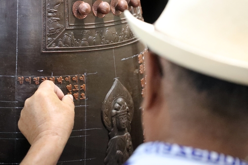 | ▲ 범종에 새겨넣을 글자 작업을 하는 원광식 주철장 [촬영 천경환 기자] |