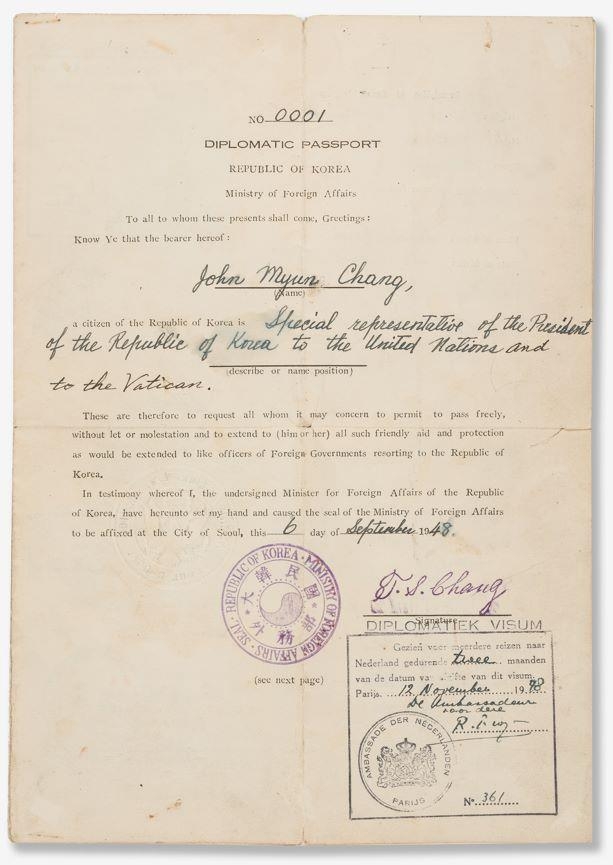 이 가운데 1948년 제3차 유엔 총회 당시 수석대표로 파견된 장면 전 총리가 소지했던 대한민국 외교관 여권 1호, 대한민국 승인에 대한 1948년 12월 유엔 총회 표결 결과지, 장면 총리의 수첩 등이 눈길을 끈다.