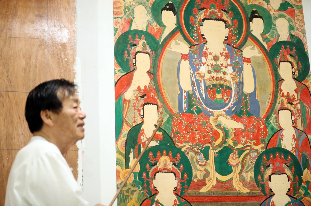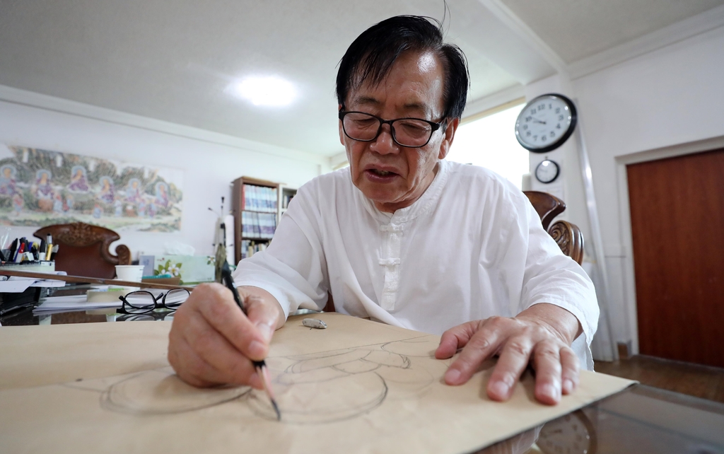 | ▲ 탱화 설명하는 권현규씨 (청주=연합뉴스) 천경환 기자 = 청주시 청원구 내덕동 작업실에서 단청장 기능 보유자인 권현규씨가 탱화에 대해 설명하고 있다. 2022.8.19.