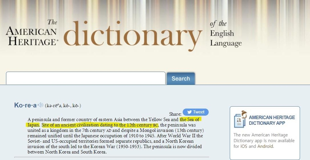 (서울=연합뉴스) 왕길환 기자 = 콜린스, 아메리칸 헤리티지, 딕셔너리 닷컴 등 세계 유명 영어사전의 한국사 왜곡이 심각한 상황이라고 사이버 외교 사절단 반크가 11일 밝혔다.