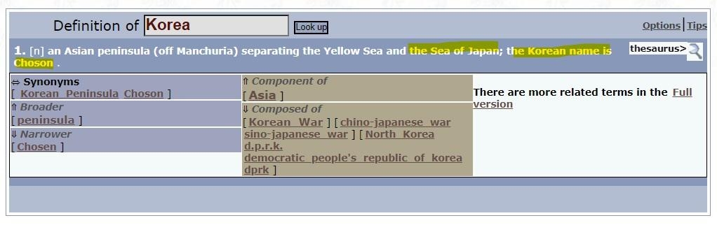 룩웨이업 닷컴과 라임존 닷컴 영어사전은 'Korea'의 한국어 이름이 'Choson'(조선)이라고 잘못된 정보를 제공한다. 바른 표기는 'Daehanminguk'(대한민국) 또는 'Hanguk'(한국)이다.