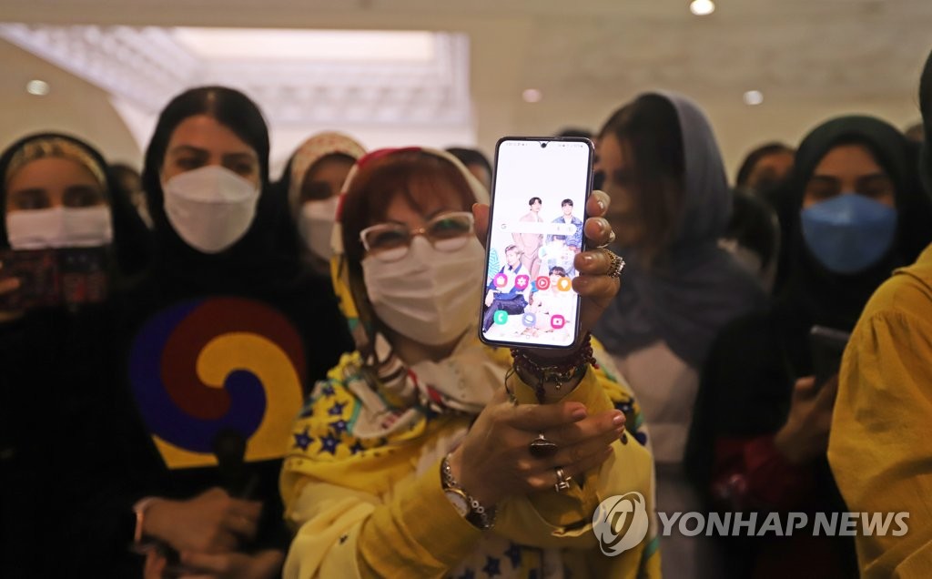 | ▲ '이란에서도 K-팝 인기 많아요' (테헤란=연합뉴스) 이승민 특파원 = 12일(현지시간) 이란 테헤란 '그랜드 무쌀라'에서 열린 이란 국제 북페어 한국 부스에서 이란인이 한류 아이돌 사진으로 꾸며진 스마트폰 배경 화면을 자랑하고 있다. 2022.5.13 logos@yna.co.kr |
