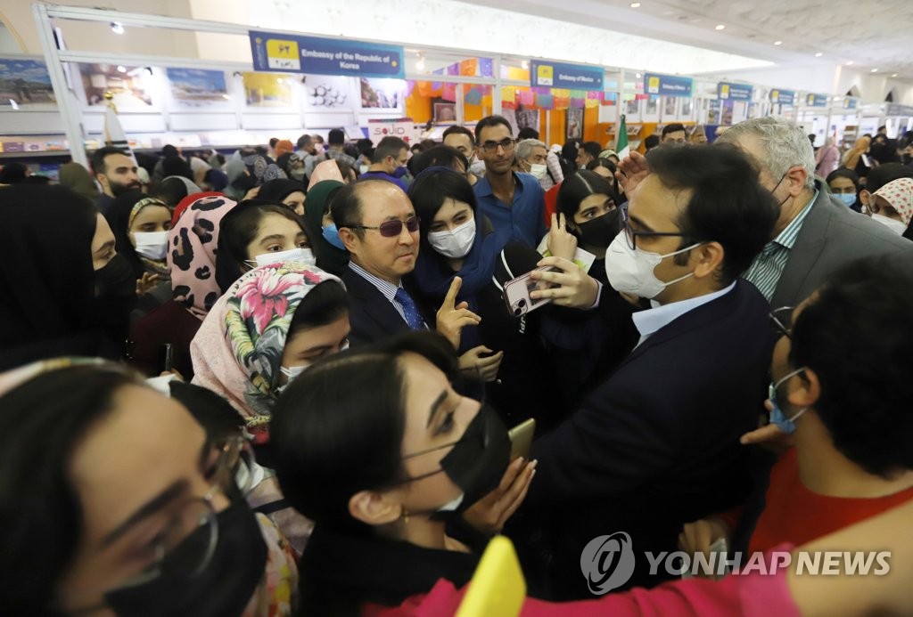 | ▲ '한국 대사님과 사진 찍고 싶어요' (테헤란=연합뉴스) 이승민 특파원 = 12일(현지시간) 이란 테헤란 '그랜드 무쌀라'에서 열린 이란 국제 북페어 한국 부스 앞에 윤강현 주이란 한국대사와 사진을 찍으려는 인파가 모여있다. 2022.5.13 logos@yna.co.kr |