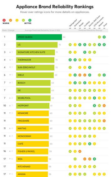 15일 업계에 따르면 미국의 소비자 매체인 컨슈머리포트는 25개 가전 브랜드를 대상으로 조사한 '가전 브랜드 신뢰성 평가(Appliance Brand Reliability Rankings)'를 최근 발표했다.