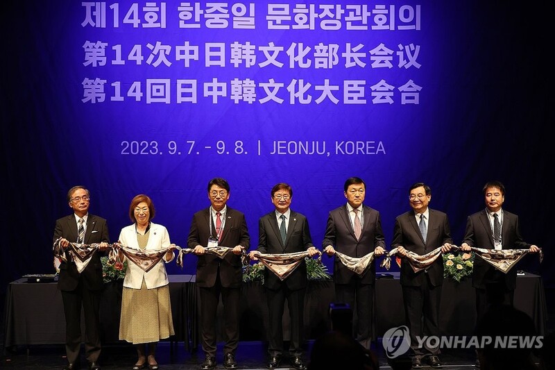 박보균 문화체육관광부 장관, 나가오카 케이코 일본 문부과학대신, 후허핑 중국 문화여유부장은 지난달 8일 전북 전주에서 제14회 한중일 문화장관회의를 열고 2024 동아시아문화 도시를 선포했다.