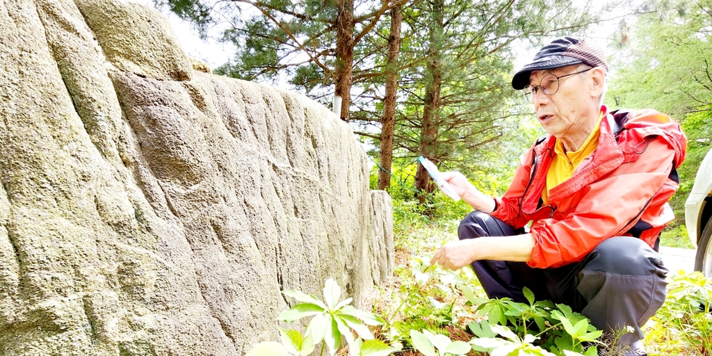 | ▲ 운락국민학교 표지석 살피는 김부래 산악인 [촬영 배연호] |