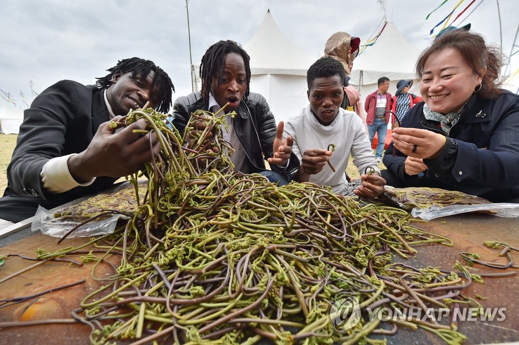 | ▲ '고사리가 신기해' (서귀포=연합뉴스) 박지호 기자 = 28일 오전 제주 서귀포시 남원읍 한남리 일대에서 열린 '한라산 청정 고사리 축제'에 참가한 외국인 관광객들이 삶은 고사리를 신기하게 바라보고 있다. 2019.4.28 jihopark@yna.co.kr [연합뉴스 자료사진] |