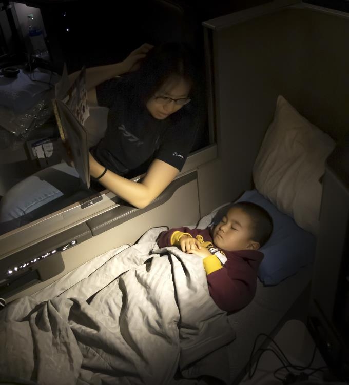 스트레칭을 위해 기내 이곳저곳을 기웃거리고 있는데 비즈니스석 맨 앞자리에서 평온하게 잠들었던 한 아시아계 어린이의 모습이 눈에 들어왔다.
