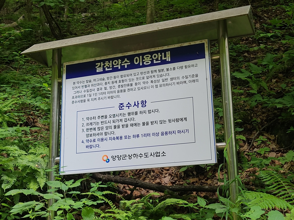 (양양=연합뉴스) 이종건 기자 = '아홉마리 용이 잠시 쉬어갔다는 고개를 넘어 맛보는 한 모금 새콤한 약수는 사람의 오장육부를 깨끗하게 씻어 주기에 더할 나위 없는 명약'