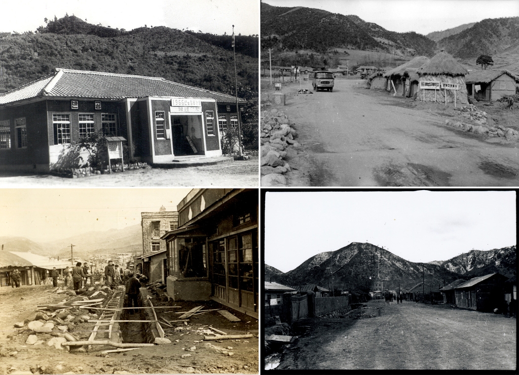 | ▲ 1966년 서화면 면사무소(사진 왼쪽 위부터 시계방향으로), 서화면 서흥리 사천리 모습, 서화면 천도리 거리, 서화면 시가지 하수도 정비 모습. [인제군 제공. 재판매 및 DB 금지] |
