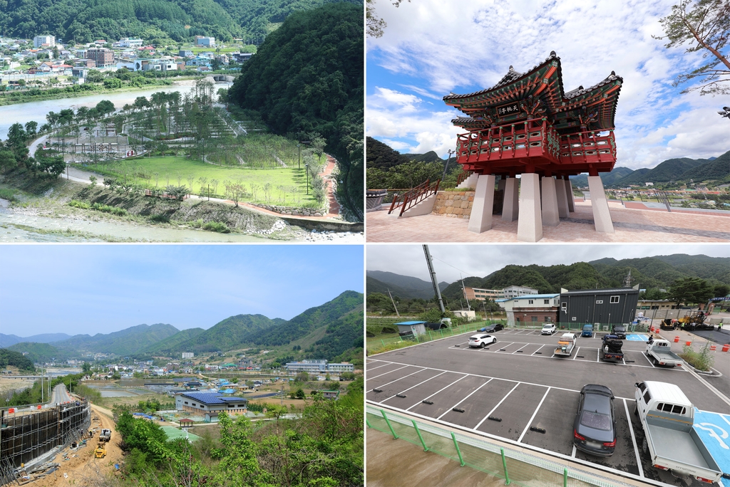 | ▲ 서화면 물빛테마공원(사진 왼쪽 위부터 시계방향으로), 비득고개 정자, 서화만 주차장, 서화면 전체 모습. [인제군 제공. 재판매 및 DB 금지] |