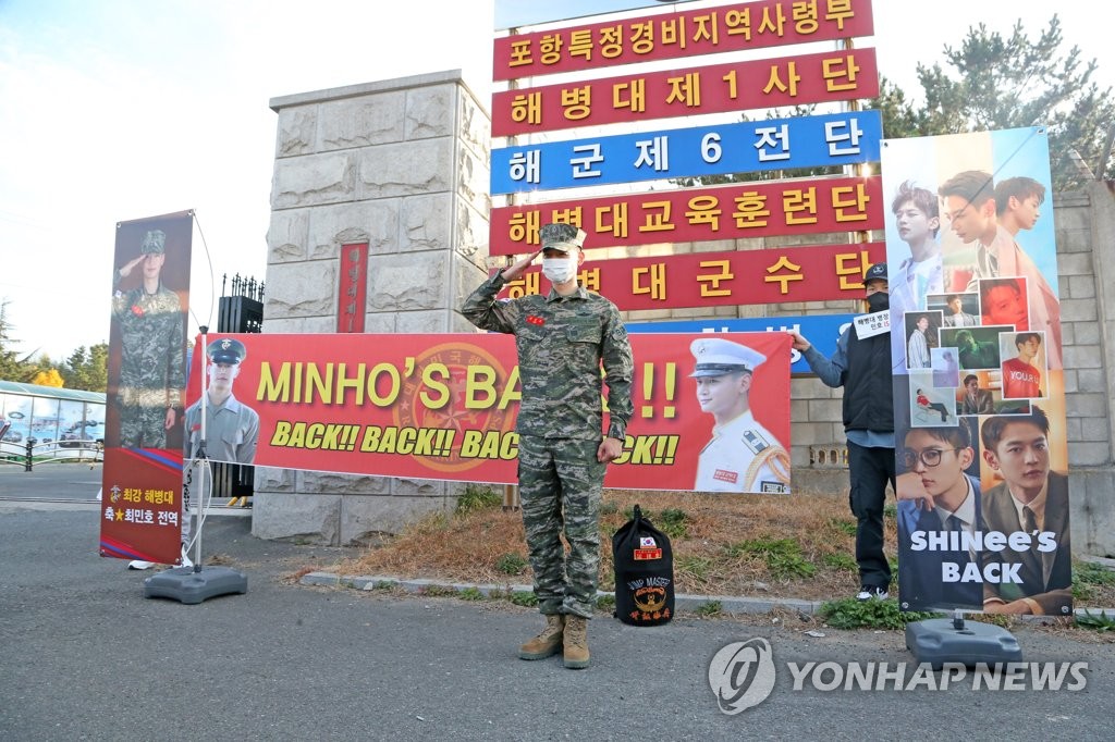 | ▲ This Nov. 15, 2020, file photo shows Minho of boy band SHINee saluting fans after successfully completing his military service at a Marine Corps base in Pohang, North Gyeongsang Province. (Yonhap) |