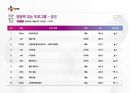 ☞ CPI 지수 = 지상파, 종합편성채널, 케이블 등 29개 채널 프라임 시간대 방송 드라마, 연예·오락, 음악, 인포테인먼트 프로그램을 대상으로 시청자 행동을 파악하는 지표. 방송통신위원회 방송콘텐츠가치정보분석시스템(RACOI)을 통해 주간 단위로 프로그램 관련 시청자 데이터(동영상 조회수, 게시글수, 댓글수)를 수집해 200점 기준 표준점수로 환산해 평균을 산출한다.