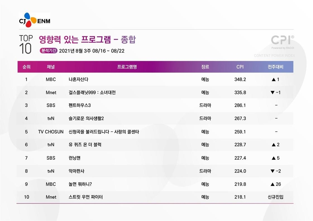 한편, 금주 CPI 1위는 MBC TV 예능 '나 혼자 산다'가 차지했다.