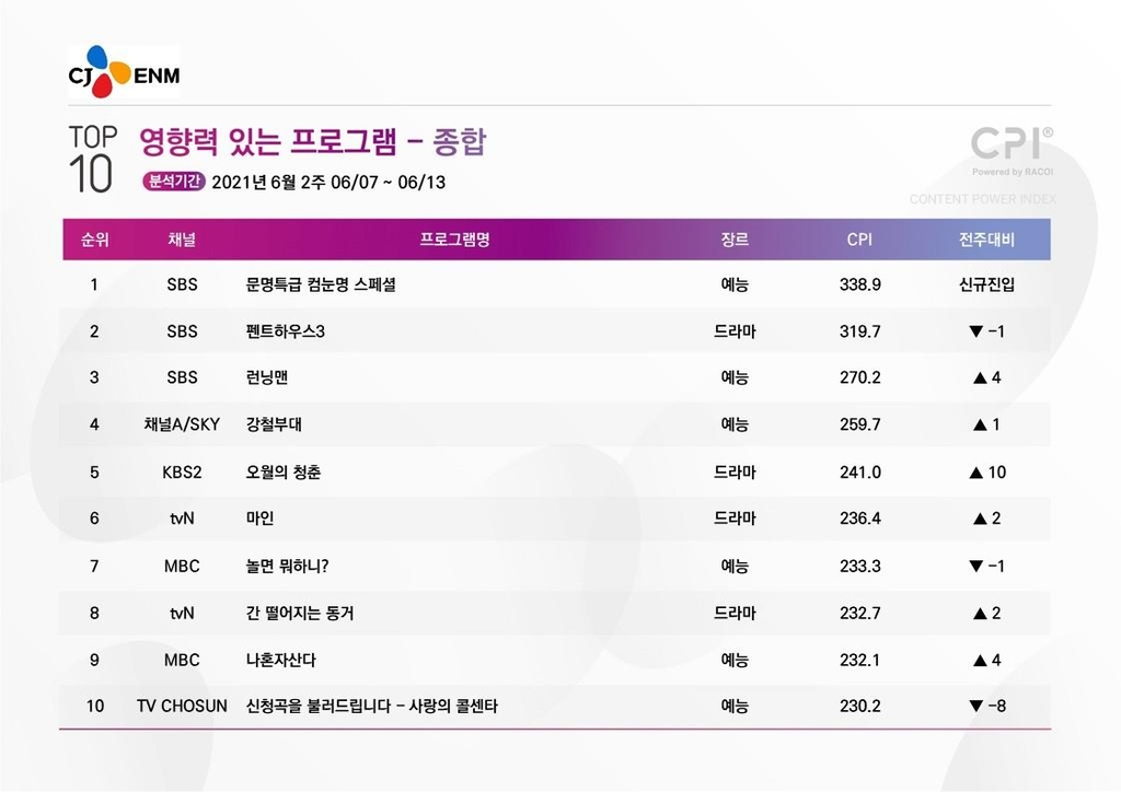 22일 CJ ENM이 발표한 6월 둘째 주(7~13일) 콘텐츠영향력평가지수(CPI·하단용어설명 참조) 집계에서 SBS TV '문명특급 컴눈명 스페셜'이 1위로 새롭게 진입했다. CPI 지수는 338.9로 2위인 같은 채널 드라마 '펜트하우스3'(319.7)와 크게 격차를 벌렸다.