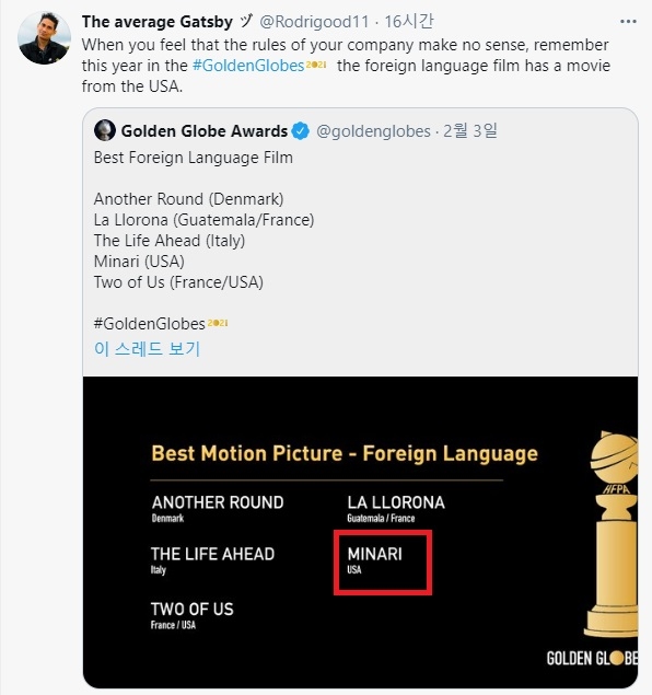 | ▲ '최우수 외국어영화는 미국 영화?' 골든글로브 최우수 외국어 영화상에 국가명이 미국(USA)으로 표시(빨간 네모)된 '미나리'가 포함된 것을 지적하는 외국 트위터 이용자 [출처: 트위터 화면 갈무리] |