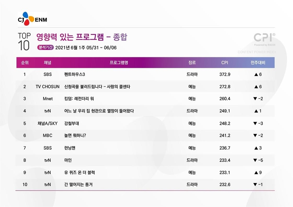 한편, CPI 1위는 전주보다 6계단 오른 SBS TV '펜트하우스' 시즌3가 차지했다.