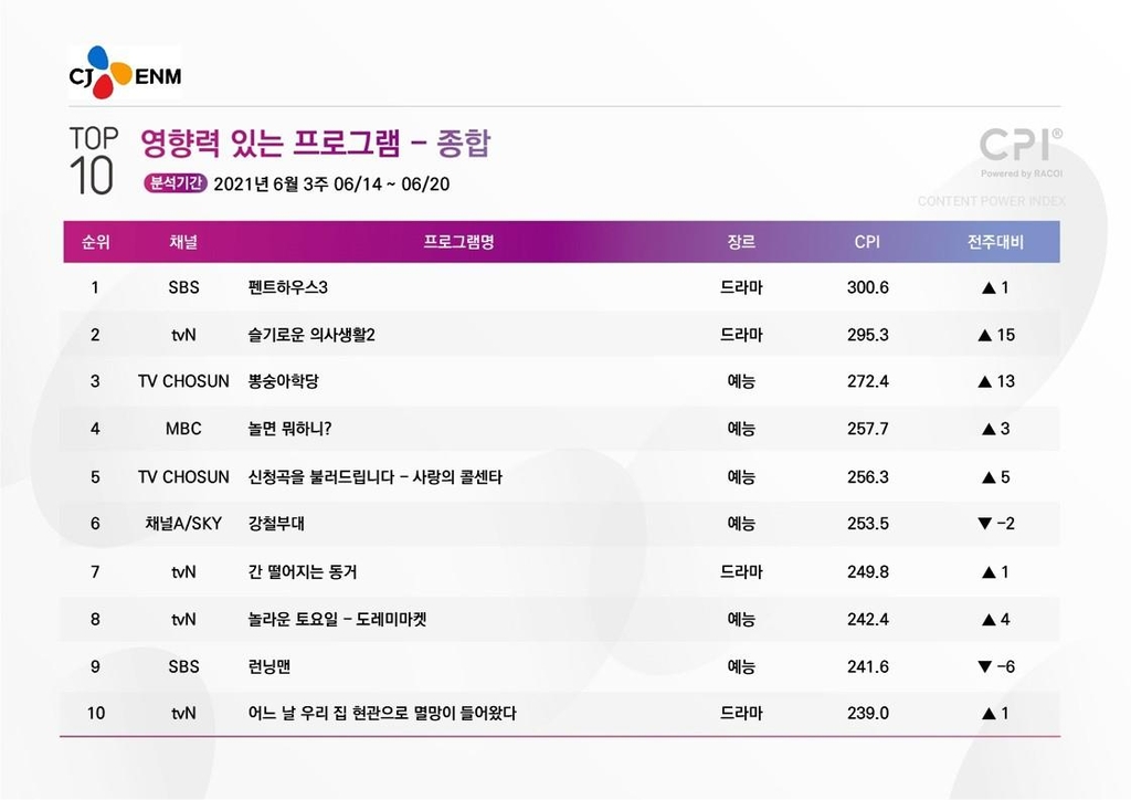 29일 CJ ENM이 발표한 6월 셋째 주(14~20일) 콘텐츠영향력평가지수(CPI·하단용어설명 참조) 집계에서 tvN 목요드라마 '슬기로운 의사생활' 시즌2가 전주보다 15계단 올라 2위에 진입했다. CPI 지수는 295.3.