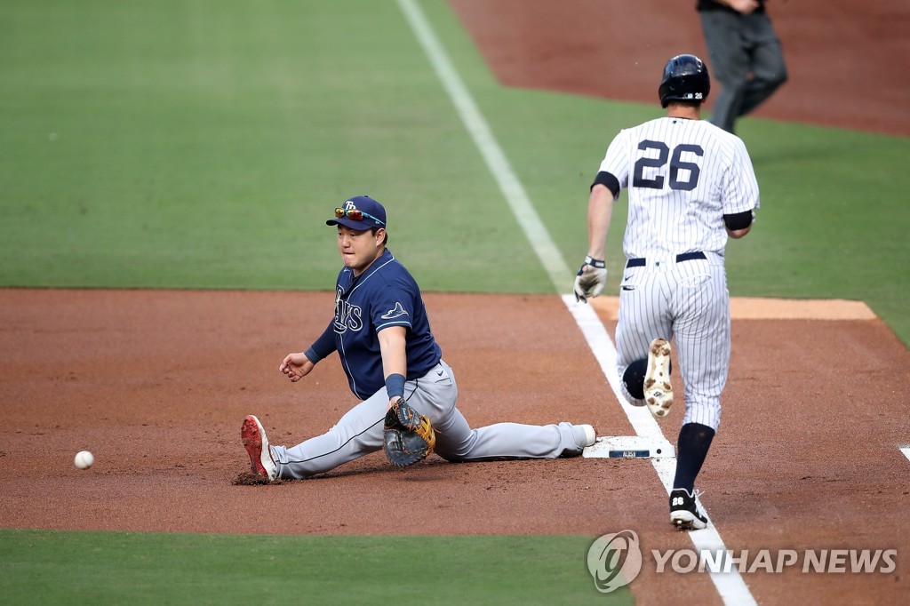 | ▲ In this Getty Images file photo from Oct. 8, 2020, the Tampa Bay Rays' first baseman Choi Ji-man (L) tries to scoop the ball as DJ LeMahieu of the New York Yankees runs to the bag during the bottom of the first inning of Game 4 of the American League Division Series at Petco Park in San Diego. (Yonhap) |